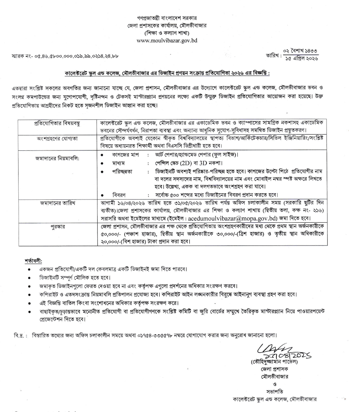 কালেক্টরেট স্কুল এন্ড কলেজ, মৌলভীবাজার এর ডিজাইন প্রণয়ন সংক্রান্ত প্রতিযোগিতা ২০২৬ এর বিজ্ঞপ্তি