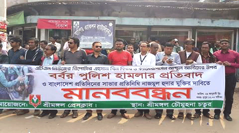 ২৯ জানুয়ারী রবিবার বেলা ১২টায় শ্রীমঙ্গল চৌমুহনা চত্তরে শ্রীমঙ্গল প্রেসক্লাব এর আয়োজনে ও প্রেসক্লাব সভাপতি গোপাল দেব চৌধুরীর সভাপতিত্বে মানববন্ধন শেষে প্রতিবাদ সমাবেশে বক্তব্য রাখেন প্রেসক্লাব সম্পাদক এম ইদ্রিস আলী, বিকুল চক্রবর্ত্তী , ইসমাইল মাহমুদ , হৃদয় দেবনাথ, সৈয়দ আমিরুজ্জামান প্রমুখ। সমাবেশে সাংবাদিকরা বলেন অবিলম্বে সাংবাদিক নির্যাতন বন্ধ ও সাংবাদিক নির্যাতনকারী পুলিশ সদস্যদের দৃষ্টান্তমুলক শাস্তির আওতায় না আনলে কঠোর কর্মসূচীর ডাক দিবেন তারা।