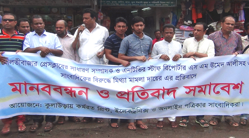 কুলাউড়া প্রতিনিধি॥ সংবাদ প্রকাশ ও প্রচারের জেরে আলোচিত নানা অপকর্মের হোতা, প্রতারক ও মামলাবাজ সাইফুল ইসলাম সজীব কর্তৃক মৌলভীবাজার জেলা প্রেসক্লাবের সাধারণ সম্পাদক, এনটিভির স্টাফ রিপোর্টার এস এম উমেদ আলীসহ ৩ সাংবাদিক ও ৫ পুলিশ কর্মকর্তার বিরুদ্ধে ষড়যন্ত্রমূলক মিথ্যা মামলা প্রত্যাহারের মৌলভীবাজার জেলায় প্রতিবাদের ঝড় বইছে। প্রতিবাদে কুলাউড়ায় এক মানববন্ধন ও সমাবেশ করেছে কুলাউড়ার কর্মরত প্রিন্ট, ইলেকট্রনিকস ও অনলাইন পোর্টালের সাংবাদিকরা। এসময় একাত্মতা পোষণ করে ইউনাইটেড রয়েল্স ক্লাব ও আশিকানে ফুলতলী (রহঃ) কুলাউড়া।