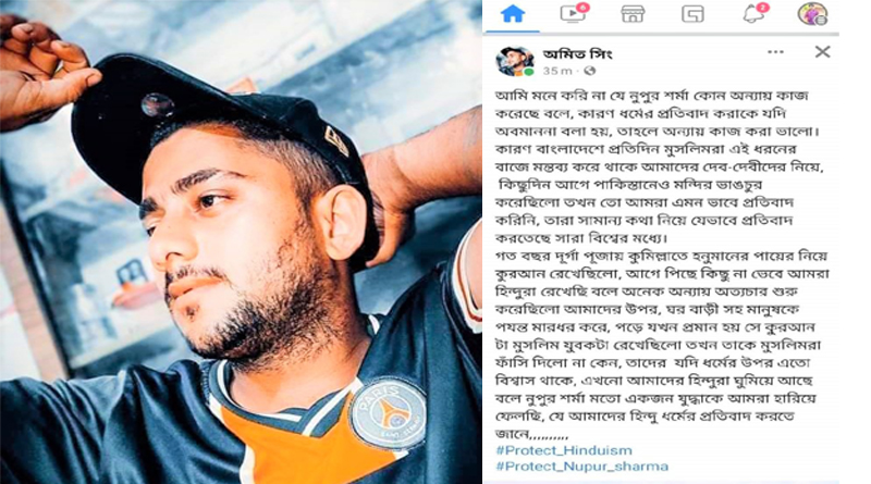 রোববার ১২ জুন রাতে সোসাল মিডিয়ায় নুপুর শর্মাকে সমর্থন করে উস্কানিমূলক পোস্ট দিয়ে সাম্প্রদায়িক দাঙ্গার চেষ্টা করে সে। এতে পোস্টটি মুহুর্তের মধ্যে ভাইরাল হয়ে পড়ে। এলাকার ধর্মপ্রাণ মুসলমানেরা প্রতিবাদ করে অমিত সিং এর বাসা ঘেরাও করে। পরে অমিত সিং তার এক বন্ধুর ফেসবুক থেকে লাইভে এসে ক্ষমা চান। কিন্তু ক্ষমা চাইলেও শেষ দিকে বলেন এটা বাংলাদেশ সেটা সে জানতো না।