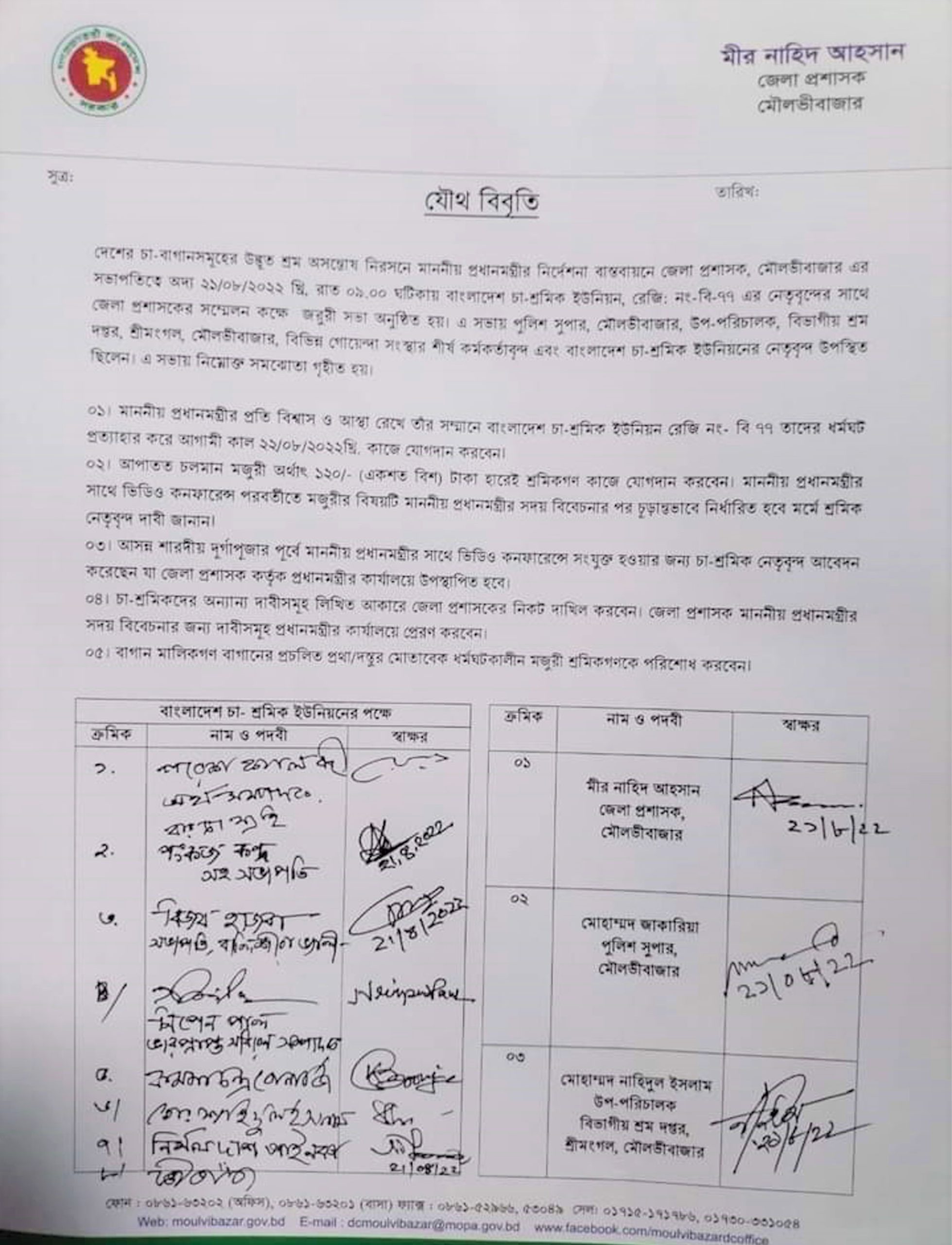 এদিকে চলমান আন্দোলন নিরসনে সরকারের জেলা প্রশাসন, শ্রম অধিদপ্তরের এর সাথে দফায় দফায় বৈঠক হয়। কোন বৈঠকেই বিষয়টি সুরাহা না হলে গত শনিবার শ্রীমঙ্গল শ্রম অধিদপ্তরে এক বৈঠকে জানানো হয় বিষটি প্রধানমন্ত্রীর নজরে গেছে। প্রধানমন্ত্রী দেশের বাহিরে যাবেন তিনি বলেছেন বাহির থেকে এসে গণভবনে শ্রমিকদের নিয়ে বসবেন এবং তাদের কথা শুনে তাদের সুযোগ সুবিধার বিষয়টি দেখবেন। এটি প্রথমে চা শ্রমিক নেতারা মানলেও পরে তা প্রত্যাখ্যান করেন।