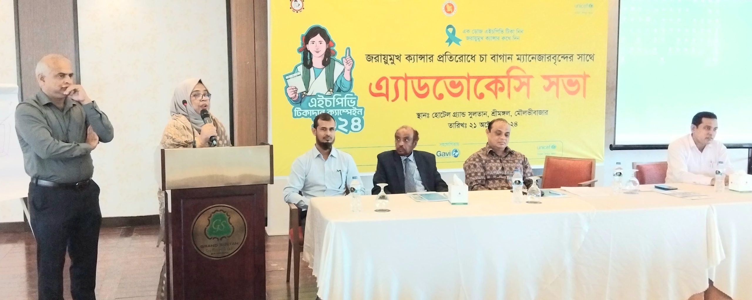 স্টাফ রিপোর্টার : ‘এক ডোজ এইচপিভি টিকা দিন জরায়ুমূখ ক্যান্সার রুখে দিন’ এই প্রতিপাদ্যকে সামনে রেখে এই প্রথমবারের মতো জরায়ুমুখ ক্যান্সার প্রতিরোধ (এইচপিডি) টিকা ক্যাম্পেইন উপলক্ষে এক অ্যাডভোকেসি সভা চা বাগান ব্যবস্থাপকদের নিয়ে পাঁচতারকা হোটেল গ্র্যান্ড সুলতান টি রিসোর্ট এন্ড গলফ হোটেলে অনুষ্ঠিত হয়েছে। ইউনিসেফ সিলেট বিভাগীয় অফিসের উদ্যোগে এ এ্যাডভোকেসি সভা আয়োজন করা হয়।