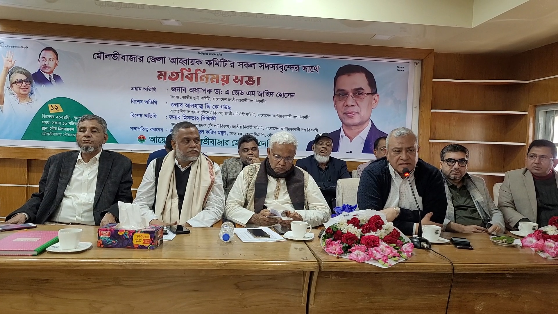 তিনি ১২ ডিসেম্বর বৃহস্পতিবার দুপুরে মৌলভীবাজার পৌরসভা মিলনায়তনে জেলা বিএনপির আয়োজনে আহবায়ক কমিটির সকল সদস্যদের সাথে মতবিনিময় সভায় প্রধান অতিথি বক্তব্য রাখতে গিয়ে এসব কথা বলেন। ডা: জাহিদ বলেন- মরহুম এম সাইফুর রহমান স্যারের মতো অনেক মুরুব্বিদের ত্যাগ তিতিক্ষা,শ্রম,কস্ট দেয়ার প্রেক্ষিতে আজকের বিএনপি এ পর্যায়ে এসেছে। উনাদের কথা ভুলে গেলে চলবে না তো। আমাদের মনে রাখতে হবে এমন গুনীদের ত্যাগ তিতিক্ষা শ্রমের কথা। এখন কেউ যদি মনে করে আমরাই সব তাহলে তো হবে না। গুনীদের সম্মান না করলে আপনাকেও কেউ সম্মান করবে না। আজকের ইয়ং জেনারেশন ছাত্রদল,যুবদল আমাদের কাছ থেকেই শিখবে। যে মানুষ গুলো এই দলটাকে এই পর্যন্ত আনছে তাদের প্রতি আমাদের শ্রদ্ধা জানানো উচিত। তিনি বলেন- আপনাদের মৌলভীবাজারের কপাল ভাল একজন শহীদ হয় নাই। কিন্তু হবিগঞ্জে দেখেন একদিনে কতজন মারা গেছে। তারপর সিলেট দেখেন। সারা বাংলাদেশ ৪২২ জন বিএনপির নেতাকর্মী মারা গেছে জুলাই এবং আগষ্ট মাসে। আর হাজার হাজার নেতাকর্মী মারা গেছে গত সাড়ে ১৫ বছরে। ছাত্র জনতার আন্দোলনে ২ হাজারেরও বেশি ইন্তেকাল করেছেন। শহীদ হয়েছেন। ত্রিশ হাজারেরও বেশি চোখ নাই পা নাই হাত নাই। তাদের জন্য আজকে আমরা কথা বলতে পারতেছি। ইলিয়াস আলী কোথায় আছে আমরা বলতেও পারি না। তার স্ত্রী ছেলে মেয়েরা জানে না। সেকি জীবিত না মৃত। আয়না ঘরে না তার জন্য দোয়া করবে। কাজেই এ জিনিস গুলো যদি ভুলে যান তাহলে কিন্তু খুবই দুর্ভাগ্য আমাদের জন্য অপেক্ষা করছে। কাজেই মনে রাখতে হবে তাদের সবার অবদান। ইলিয়াস আলী না শুধু তার ড্রাইভারের অবদান। তার ড্রাইভার কোথায়। দিনার কোথায়। জুনেদ কোথায়। চৌধুরী আলম কোথায়। সাবেক এমপি হিরু কোথায়। জানি না। সেই আয়না ঘর থেকে আমরা কিছু লোককে ফিরত পেয়েছি কিন্তু মোষ্ট অব দি পিপুল কে তো আমরা ফেরত পাইনি।