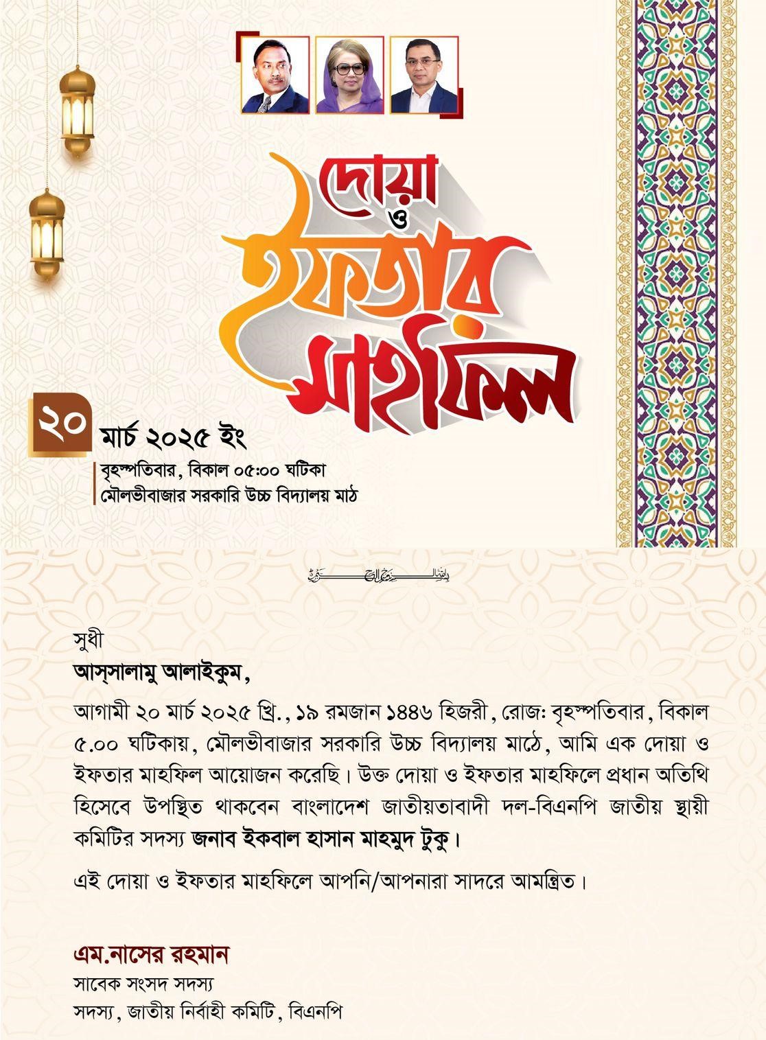 তিনি জানান, দীর্ঘ সাড়ে ১৫ বছর পর ফ্যাসিষ্ট মুক্ত পরিবেশে ৮/১০ হাজার তৃণমুলের নেতাকর্মীদের সম্মানে এই বিশাল ইফতার মাহফিলের আয়োজন করেছেন এতদঅঞ্চলের গণমানুষের নেতা এম নাসের রহমান। এই দোয়া ও ইফতারমাহফিলে সফল করতে দলের বিভিন্ন পর্যায়ের নেতৃস্থানীয়রা দিন রাত পরিশ্রম করে যাচ্ছেন। বিশেষ করে মৌলভীবাজার সদর-রাজনগর উপজেলাসহ জেলার প্রতিটি উপজেলা ও পৌর বিএনপি অঙ্গসংঠনসমূহের নেতাকর্মীকে এই দোয়া ও ইফতার মাহফিলে উপস্থিত থাকার জন্য এম নাসের রহমানের পক্ষ থেকে আমন্ত্রণ জানানো হচ্ছে।