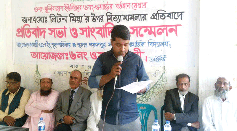 ১৬ ফেব্রুয়ারি বৃহস্পতিবার সন্ধ্যায় গয়াসপুর সরকারি প্রাথমিক বিদ্যালয়ে প্রতিবাদ সভা ও সংবাদ সম্মেলনে ওয়ার্ডেও শতাধিক মানুষ উপস্থিত ছিলেন। শুরুতে সংবাদ সম্মেলনে লিখিত বক্তব্যে ৬নং ওয়ার্ড সদস্য লিটন মিয়া বলেন, বিগত ইউপি নির্বাচনে আমি জনগণের ভোটে ওয়ার্ড সদস্য নির্বাচিত হই। নির্বাচিত হবার পর থেকে আমি ওয়ার্ডবাসীর জন্য উন্নয়নমুলক কাজ করতে আপ্রান চেষ্ঠা চালিয়ে যাচ্ছি। কিন্তু একটি কুচক্রী মহল আমার উন্নয়ন কাজে বাধা ও আমার ক্ষতি করতে হীন প্রচেষ্ঠায় লিপ্ত আছে। লিখিত বক্তব্যে তিনি আরো বলেন, ২৩/০৭/২০১৬ ইং তারিখে টিকরপাড়ার পূর্ব পার্শ্বেও গয়াসপুর এলাকায় লেবু মিয়ার বাড়িতে রাত সাড়ে ১২টায় অসামাজিক কার্যক্রম চলছে এমন খবর দেন স্থানীয়রা। এ অসামাজিক কাজে লিপ্ত থাকা অবস্থায় লেবু মিয়ার মেয়ে হেনা বেগম ও বড়দল গ্রামের মুজিব মিয়াকে স্থানীয়রা আটক করে। পরে রাজনগর থানাকে বিষয়টি অবহিত করা হলে থানার এসআই দৌস মোহাম্মদ হেনা ও মুজিবকে আটক করেন। পরবর্তীতে তাদের বিরুদ্ধে থানায় মামলা নং-২৯/১৬ (রোজ) রুজু হয়। তিনি বলেন ওইদিন রাজনগর উপজেলা ভাইস চেয়ারম্যান ফারুক মিয়া থানায় জোর তদবীর চালিয়ে যান তাদেও মুক্ত করার জন্য। রাজনগর থানার ওসি তার তদবীর আমলে না নিয়ে তাদের আদালতে প্রেরণ করেন। তিনি বলেন,পরে হেনা ও মুজিব গত ২৩/১০/১৬ইং তারিখে আদালতে সেচ্ছায় নিজের দোষ স্বীকার করলে অব্যাহতি পায়। লিখিত বক্তব্যে লিটন সাংবাদিকদের বলেন, উক্ত মামলায় আমি স্বাক্ষী থাকায় আমার বিরুদ্ধে ষড়যন্ত্র করে হেনা বেগম এর খালা জৈনক রুজিনা বেগম কে দিয়ে গত ২৩/০৭/২০১৬ ইং তারিখে ঘটনা উল্যেখ করে নারী ও শিশু নির্যাতন দমন ট্রাইব্যুনাল আদালতে একটি ধর্ষন মামলা দায়ের করা হয়। মামলা নং-৩৬৮/১৬ইং । এই মামলায় মুহিবুর মিয়া,মুসা মিয়া,গোলাপগঞ্জ থানার রানাপিং গ্রামের রেজাউল করিম নিজামসহ আমাকে আসামী করে নারী ও শিশু নির্যাতন ২০০০ (সংশোধিত ২০০৩) এর ৯(১)/৩০ ধারায় এ মিথ্যে মামলাটি দায়ের করা হয়। লিখিত অভিযোগে তিনি আরো বলেন,রাজনগর উপজেলা ভাইস চেয়ারম্যান ফরুক মিয়া সমাজে বলে বেড়িয়েছেন যে, আমাকে ওয়ার্ড সদস্য পদে থেকে কাজ করতে দেবেন না। তিনি আরো জানান, রুজিনা বেগম তারই নির্দেশে আমার বিরুদ্ধে মামলা করেছে। পরবর্তীতে আমার বিরুদ্ধে আনিত অভিযোগ যাচাই-বাচাই করে মামলার সত্যতা উদঘাটন করে একটি প্রতিবেদন দাখিল করতে মাননীয় আদালত মামালটি রাজনগর থানায় অর্পণ করে। পরে থানার এসআই দৌস মোহাম্মদ মামলটি পূর্ণ তদন্ত করে মিথ্যা মর্মে একটি প্রতিবেদন আদালতে পাঠান। পরবতীতে বাদিনীর না রাজীর প্রেক্ষিতে ট্রাইব্যুনাল আমার বিরুদ্ধে ওয়ারেন্ট ইস্যু করলে আমি আদালতে আত্বসমর্পণ করে এক সপ্তাহ পর জামি