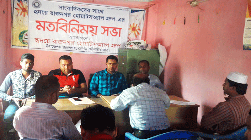 ২ মার্চ বৃহস্পতিবার বিকালে রাজনগর প্রেসক্লাবে সাংবাদিকদের সঙ্গে এ গ্রুপের সদস্যরা মতবিনিময় করেন। এসময় সামাজিক যোগাযোগ মাধ্যম হোয়াটসঅ্যাপে সদস্যবৃদ্ধি এবং উপজেলার বিভিন্ন ইউনিয়নে কন্যাদায়গ্রস্ত, অর্থাভাবে চিকিৎসা বঞ্চিত ও দরিদ্র মেধাবী শিক্ষার্থীদের নিয়ে সাহায্যের লক্ষ্যে এ গ্রুপের প্রতিষ্ঠা বলে জানান মতবিনিময় সভায় হৃদয়ে রাজনগর হোয়াটসঅ্যাপ গ্রুপের এডমিন যুক্তরাজ্য প্রবাসী জুনেদ আহমদ শিপু, প্রতিনিধি আহমদউর রহমান ইমরান ইউপি প্রতিনিধি আক্তার হোসেন, ছালিক আহমেদ, টিপু আহমেদ, খালেদ আহমদ, শামছুল ইসলাম, মুনিম আহমদ। রাজনগর প্রেসক্লাবের সদস্যদের মধ্যে ছিলেন ভারপ্রাপ্ত সভাপতি আউয়াল কালাম বেগ, সাধারণ সম্পাদক আব্দুল আজিজ, কোষাধ্যক্ষ আব্দুর রহমান সোহেল, সদস্য ফরহাদ হোসেন, কামরুল আহমদ প্রমুখ।