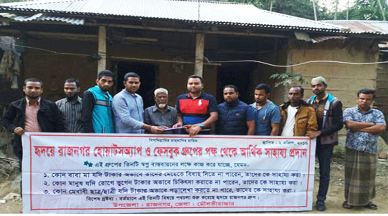 রাজনগর সংবাদদাতা॥ টাকার অভাবে মেয়েকে বিয়ে দিতে পারছেন না কন্যাদায়গ্রস্থ পরিবার, অসহায় ও অস্বচ্ছল ব্যাক্তির চিকিৎসা আটকে আছে অর্থের অভাবে কিংবা গরীব অথচ মেধাবী শির্ক্ষাথীর লেখাপড়া বন্ধ হয়ে যাবে এমন খবর শুনেই সাহায্যের হাত বাড়িয়ে দিচ্ছেন একদল তরুণ। প্রযুক্তিকে কাজে লাগিয়ে খুব কম সময়ে আর্থিক অনুদান সংগ্রহ করে পৌঁছে দিচ্ছেন অসহায় এসব মানুষের হাতে। নিজের জন্মস্থান ও মানুষের প্রতি ভালোবাসার বহিঃপ্রকাশ ঘটিয়ে বছরের ২রা এপ্রিল জনপ্রিয় সামাজিক যোগাযোগ মাধ্যম হোয়াটসঅ্যাপে ‘হৃদয়ে রজনগর’ নামে একটি গ্রুপ খুলেন উপজেলার ফতেপুর ইউনিয়নের তুলাপুর গ্রামের যুক্তরাজ্য প্রবাসী তরুণ জুনেদ আহমদ শিপু। এরপর যুক্তরাজ্যসহ বিভিন্ন দেশে অবস্থানরত রাজনগর উপজেলার পরিচিত সব প্রবাসীদের গ্রুপে যুক্ত করেন তিনি। হোয়াটসঅ্যাপের এই গ্রুপেই সদস্যদের সাথে ‘হৃদয়ে রাজনগর’-এর লক্ষ্য ও উদ্দেশ্য নিয়ে আলোচনা করেন। আলোচনার মাধ্যমে উপজেলার বিভিন্ন ইউনিয়নে কন্যাদায়গ্রস্ত, অর্থাভাবে চিকিৎসা বঞ্চিত ও দরিদ্র মেধাবী শিক্ষার্থীদের সাহায্যে কাজ করবেন বলে লক্ষ্য নির্ধারণ করেন। অস্বচ্ছল পরিবার শনাক্ত করতে ও অনুদান পৌঁছে দিতে ৮টি ইউনিয়নেই সেচ্ছাসেবায় আগ্রহী বেশ কয়েকজন যুবককে স্থানীয় প্রতিনিধি হিসেবে নিযুক্ত করেন। ওই বছরের ১৫ আগষ্ট উপজেলার ফতেপুর ইউনিয়নের ভেড়ীগাঁও গ্রামের মৃত খলিল মিয়ার মেয়ের বিয়েতে সাহায্য করতে হোয়াটসঅ্যাপ গ্রুপের সকলকে অনুরোধ করে বার্তা পাঠান। স্বতঃস্ফূর্তভাবে এগিয়ে আসেন বেশ কয়েকজন বাংলাদেশী ও প্রবাসী। ২০ আগষ্ট মেয়ের বিয়েতে খরচের জন্য ৩০ হাজার টাকা অনুদান তুলে দেন মৃত খলিল মিয়ার স্ত্রীর হাতে। এভাবেই তাদের পথচলা শুরু। এভাবেই একই এলাকার অস্বচ্ছল দুদু মিয়ার ছেলে শিমুলের চিকিৎসায়, গোবিন্দপুর গ্রামের রজব আলীর মেয়ের বিয়ে, কামারচাক ইউনিয়নের মশাজান গ্রামের মৃত আব্দুল খালিকের মেয়ের বিয়ে, একই গ্রামের মৃত ইয়াছিন উল্ল্যার মেয়ের বিয়েতে, কালাইকোনা গ্রামের মৃত আলম মিয়ার মেয়ের চিকিৎসা, টেংরা ইউনিয়নের ইলাশপুর গ্রামের রাজু রবিদাশের চিকিৎসা, উত্তরভাগ ইউনিয়নের রামপুর গ্রামের তজই মিয়ার মেয়ের বিয়ে, সদর ইউনিয়নের মজিদপুর গ্রামের মুক্তার মিয়ার চিকিৎসায় ও মুশরিয়া গ্রামের মৃত মালিক মিয়ার মেয়ের বিয়ের জন্য এ পর্যন্ত প্রায় দুই লক্ষ টাকা হোয়াটসঅ্যাপ গ্রুপের মাধ্যমে সংগ্রহ করে প্রদান করা হয়েছে। সম্প্রতি দেশে ফিরে গ্রুপের প্রতিষ্ঠাতা জুনেদ আহমদ শিপু তাদের গ্রুপের কার্যক্রম তুলে ধরে সহযোগিতা চান রাজনগর উপজেলার জনপ্রতিনিধি ও সাংবাদিকদের কাছে।