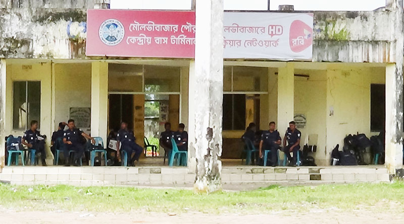 মৌলভীবাজার পৌর বাসটার্মিনালে পুলিশের অবস্থান