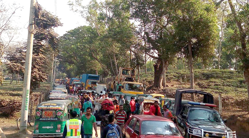 বিকুল চক্রবর্তী॥ মৌলভীবাজারের শ্রীমঙ্গল সাঁতগাও চা বাগানের ভিতরে ঢাকা-মৌলভীবাজার সড়কের নির্মানাধিন একটি ড্রাইভেশনে ৪৫ টনের ক্রেনবাহী একটি লো-বেড টেইলারের চাকা দেবে গিয়ে রাত ২টা থেকে মৌলভীবাজারের সাথে-ঢাকার যোগাযোগ বিচ্ছিন্ন রয়েছে। এতে উভয় পাশে সহ¯্রাধিক যানবাহন আটকা পড়ে দূভোর্গে পড়েছেন হাজার হাজার যাত্রী। আরেকটি শক্তিশালী ক্রেন ছাড়া তা উঠানো সম্ভবনয় বলে জানান সাঁতগাও হাইওয়ে ফাঁড়ির এ এস আই আল-আমীন।
