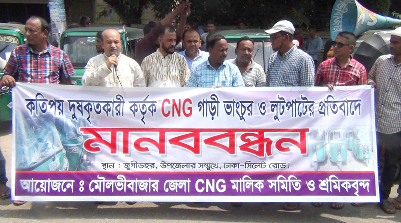 ২০ মে সোমবার দুপুরে ঢাকা-সিলেট রোডস্থ সিএনজি ফিলিং স্টেশনের সামনে মৌলভীবাজার জেলা অটো, টেম্পু, সিএনজি, শ্রমিক ইউনিয়নের উদ্যোগে মানববন্ধন শেষে বক্তব্য রাখেন জেলা সিএনজি মালিক সমিতির সভাপতি নাজমুল হক শিবলু, সহ-সহ-সভাপতি শেখ রুমেল আহমদ, পশ্চিম শহরতলী সিএনজি মালিক সমিতির সভাপতি এলাইচ মিয়া, মালিক সমিতির সাবেক সহ-সম্পাদক মোঃ শামীম আহমদ, সিএনজি মালিক সমিতির সাধারণ সম্পাদক আব্দুল মুকিত, কাগাবগা ও শমশেরগঞ্জের সভাপতি এ কে এম আখলু মিয়া ও রায়হান আহমদ বাবলু।