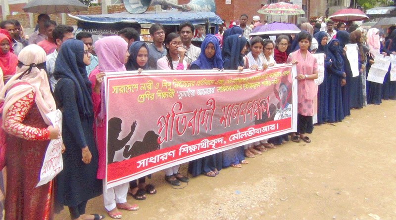 ২৩ জুলাই মঙ্গলবার দুপুরে শহরের কোর্ট পয়েন্টে সাধারণ শিক্ষার্থীদের ব্যানারে মানববন্ধন অনুষ্ঠিত হয়েছে। এতে মৌলভীবাজার সরকারী কলেজ ও মহিলা কলেজের শিক্ষার্থীরা অংশ গ্রহন করেছেন। সদর উপজেলার জগন্নাথপুর এলাকার বাসিন্দা বখাটে যুবক ছালাম প্রকাশ্যে কলেজ ছাত্রী সুমাইয়াকে মারধর ও লাঞ্চিত করায় তীব্র নিন্দা জানান শিক্ষার্থীরা। এবং অবিলম্বে বখাটে যুবককে গ্রেপ্তার ও শাস্তির দাবী করেন তারা। এছাড়া সাম্প্রতিক সময়ে দেশব্যাপি নারী ও শিশু নির্যাতনকারীদের দৃষ্ঠান্তমূলক শাস্তি দাবী করেন শিক্ষার্থীরা।