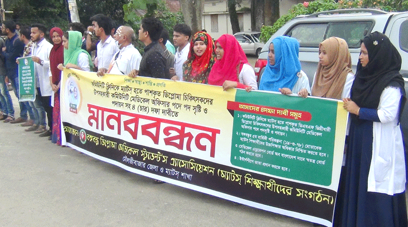 রবিবার ২৮ জুলাই দুপুরে দাবি গুলো নিয়ে মৌলভীবাজার প্রেসক্লাব চত্ত্বরে মানববন্ধন করেছে বঙ্গবন্ধু ডিপ্লোমা মেডিকেল স্টুডেন্টস এসোসিয়েশন মৌলভীবাজার শাখা। মানববন্ধন শেষে সমাবেশে মুমিনুল হক জনির সভাপতিত্বে ও মো. হাবিবুর রহমানের পরিচালনায় বক্তব্য রাখেন- অমল কান্তি দেব, শাহরিয়ার আলম, মিজানুর রহমান, রাহাত, তারেক, সাগর, প্রশান্ত, কনক পাল, জাবেদ হোসেন প্রমুখ।তাদের দাবিগুলো হলো- কমিউনিটি ক্লিনিকে ম্যাটস্ হতে পাশকৃত ডিপ্লোমা চিকিৎসকদের উপসহকারি কমিউনিটি মেডিকেল অফিসার পদে পদ সৃষ্টি ও পদায়ন। বঙ্গবন্ধুর ৫ম বার্ষিকী পরিকল্পনা (১৯৭৩-৭৮) মোতাবেক ম্যাটস্ শিক্ষার্থীদের উচ্চ শিক্ষার অধিকার নিশ্চিত করা। মেডিকেল এডুকেশন বোর্ড অব বাংলাদেশ নামে স্বতন্ত্র বোর্ড গঠন করা ও ইন্টার্ণশীপে ভাতা প্রদান।