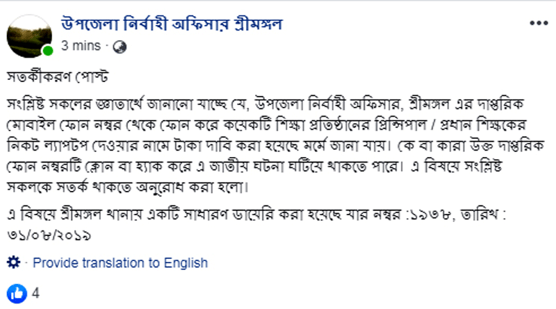 এব্যাপারে সকলকে সতর্ক থাকতে উপজেলা নির্বাহী অফিসার শ্রীমঙ্গল’ এর ফেইসবুক আইডি থেকে একটি সতর্কীকরণ পোস্ট দেয়া হয়েছে। এ বিষয়ে সংশ্লিষ্ট সকলকে সতর্ক থাকতে অনুরোধ জানিয়েছেন শ্রীমঙ্গল উপজেলা নির্বাহী অফিসার মো: নজরুল ইসলাম।