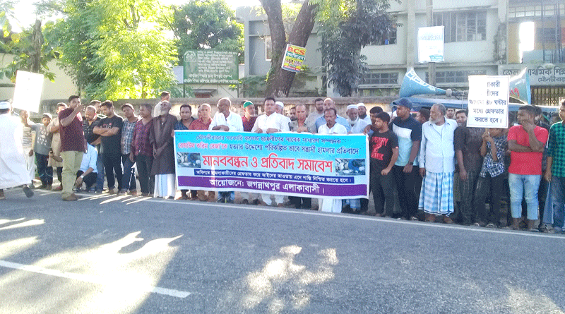 শাহ হেলাল আহমদের সঞ্চালনায় ও ইউপি সদস্য ওয়াছির মিয়ার সভাপতিত্বে ঘন্টাব্যাপী এই মানববন্ধনে প্রধান অথিতি হিসেবে বক্তব্য রাখেন মোস্তফাপুর ইউনিয়ন পরিষদের চেয়ারম্যান তাজুল ইসলাম তাজ। অন্যান্যদের মধ্যে বক্তব্য রাখেন জগন্নাথপুর সমাজকল্যাণ সংস্থার ভারপ্রাপ্ত সভাপতি আব্বাস উদ্দীন, মটরচালকলীগ সভাপতি এসএম নজরুল ইসলাম, এলাকার মুরব্বি হাজী লেবাস মিয়া, আহত রেজার চাচা ও মামলার বাদী হাজি ইলিয়াস আহমদ প্রমুখ।