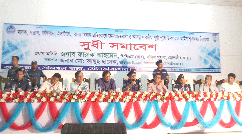 বৃহস্পতিবার ১২ সেপ্টেম্বর সন্ধ্যায় মৌলভীবাজারের শ্রীমঙ্গলে জেলা পরিষদ অডিটরিয়ামে মাদক, সন্ত্রাস, জঙ্গিবাদ ও ইভটিজিং এর বিরুদ্ধে আইনশৃঙ্খলা বিষয়ক সুধী সমাবেশে প্রধান অতিথির প্রারম্ভিক বক্তব্যে তিনি কথা বলেন।