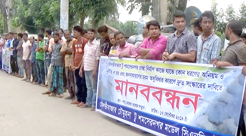 মৌলভীবাজার-শমসেরনগর রাস্তা নির্মাণ কাজ সঠিকের দাবিতে মানববন্ধন