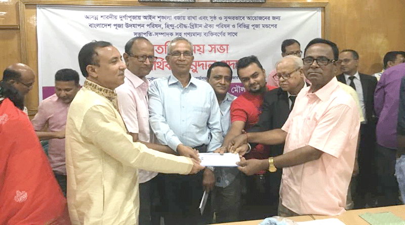 পূজা মন্ডপে মৌলভীবাজার পৌরসভার অনুদান