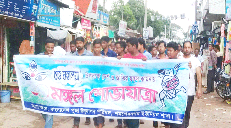প্রনীত রঞ্জন দেবনাথ॥ শারদীয় দুর্গোৎসবের পিতৃপক্ষের অবসান ঘটিয়ে শুরু হয়েছে দেবীপক্ষ। এ উপলক্ষে আনুষ্ঠানিকভাবে বিভিন্ন পূজামন্ডপে নানা অনুষ্ঠানের মধ্য দিয়ে পালিত হয় মহালয়া। ব্যাপক উৎসাহ উদ্দীপনার মধ্য দিয়ে মৌলভীবাজারের কমলগঞ্জ উপজেলার শমশেরনগরে শনিবার ২৮ সেপ্টেম্বর বিকেলে স্থানীয় শ্মশানঘাট থেকে দেশ ও জাতির মঙ্গল কামনায় শমশেরনগর ইউনিয়ন পূজা উদযাপন পরিষদের আয়োজনে এক মঙ্গল শোভাযাত্রা বের হয়। ইউনিয়ন পূজা উদযাপন পরিষদের সভাপতি মুক্তিযোদ্ধা নির্মল চন্দ্র দাশ ও সাধারণ সম্পাদক বিজিত পালের নেতৃত্বে শোভাযাত্রায় বিভিন্ন পূজা মন্ডপের ভক্তবৃন্দ অংশ গ্রহণ করেন।
