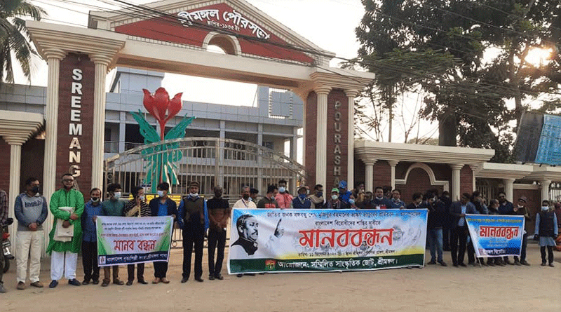 শ্রীমঙ্গলে বঙ্গবন্ধুর ভাস্কর্য ভাংচুরের প্রতিবাদে সম্মিলিত সাংস্কৃতিক জোটের মানববন্ধন