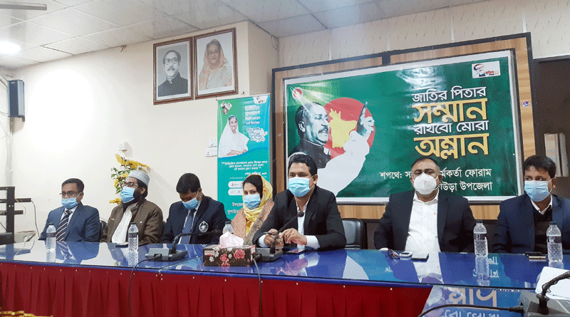 এসময় বক্তারা বলেন, বঙ্গবন্ধুর জন্যই বাংলাদেশ নামে একটি স্বাধীন সার্বভৌম গর্বিত রাষ্ট্রের জন্ম হয়েছে। তাঁরই হাত ধরে স্বতন্ত্র পরিচয়ে পৃথিবীর বুকে মাথা উঁচু করে দাঁড়ানোর দুর্লভ সম্মান বাঙালী জাতি পেয়েছে। ক্ষুধা ও দারিদ্রমুক্ত সোনার বাংলা প্রতিষ্ঠাই ছিল জাতির পিতার আজীবনের লালিত স্বপ্ন। সমাবেশে উপজেলা প্রশাসনের বিভিন্ন বিভাগীয় কর্মকর্তা-কর্মচারীবৃন্দ উপস্থিত ছিলেন। পরে উপজেলা পরিষদ প্রাঙ্গণে উপজেলা প্রশাসনের কর্মকর্তাদের অংশগ্রহণে এক মানববন্ধন অনুষ্ঠিত হয়।