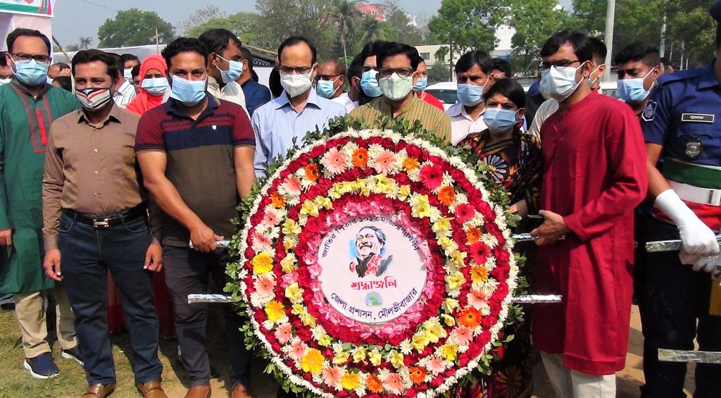 বুধবার ১৭ মার্চ সকালে বঙ্গবন্ধুর প্রতিকৃতিতে পুষ্পমাল্য প্রদানের মাধ্যমে বিনম্র শ্রদ্ধা জানান, মৌলভীবাজার-৩ আসনের সংসদ সদস্য নেছার আহমদ, সংরক্ষিত নারী আসনের সংসদ সদস্য সৈয়দা জোহরা আলাউদ্দিন, জেলা প্রশাসক মীর নাহিদ আহসান, জেলা পরিষদ চেয়ারম্যান আলহাজ্ব মিছবাহুর রহমান, পুলিশ সুপার মোহাম্মদ জাকারিয়া, মৌলভীবাজার পৌরসভা মেয়র মোঃ ফজলুর রহমান সহ বিভিন্ন দপ্তরের প্রতিনিধি, স্থানীয় জনপ্রতিনিধিগণ।
